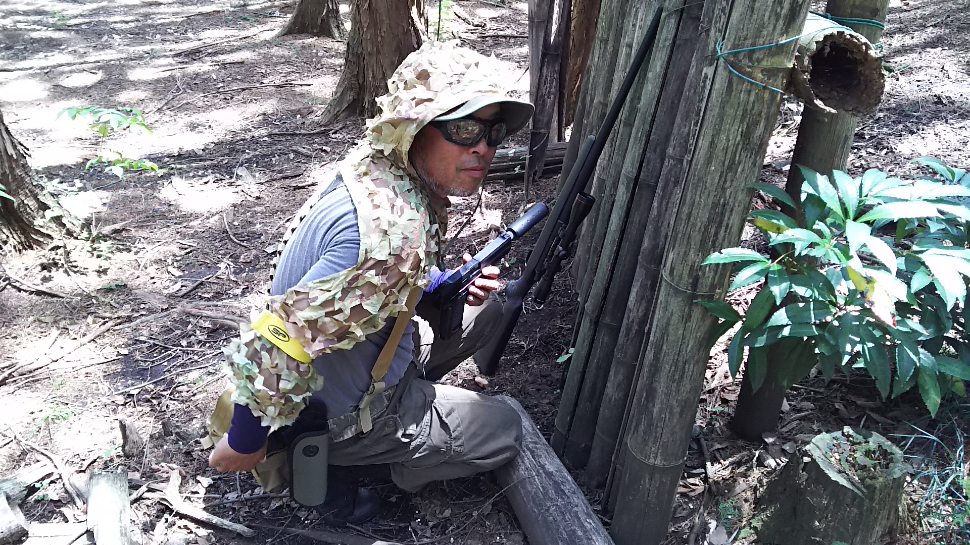 カモフラージュの被り物をしていました。