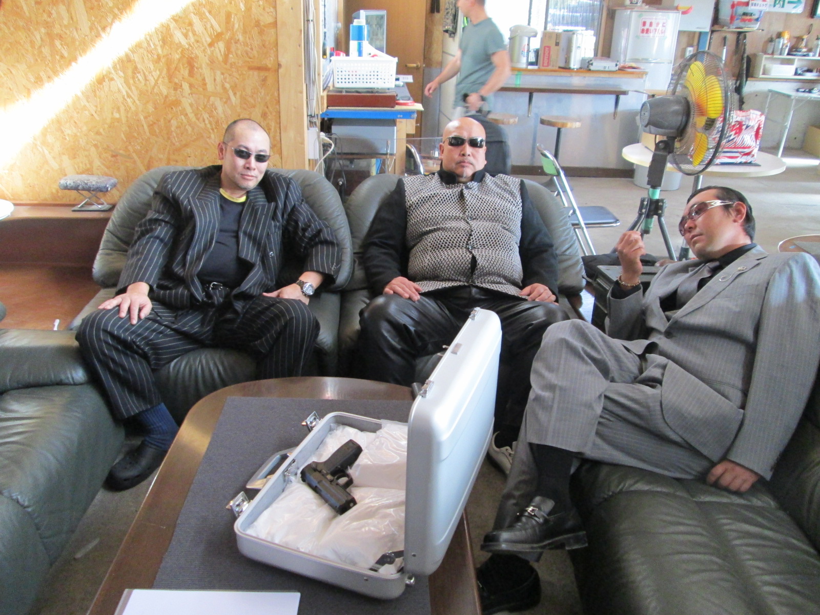 何やらアタッシュケースに白い粉と拳銃が入っているのが見えます。