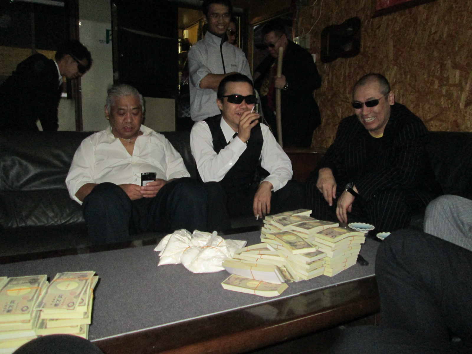 かなりの大金と白い粉を前にほくそ笑む私とウッシー刑事。