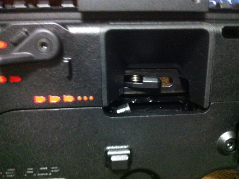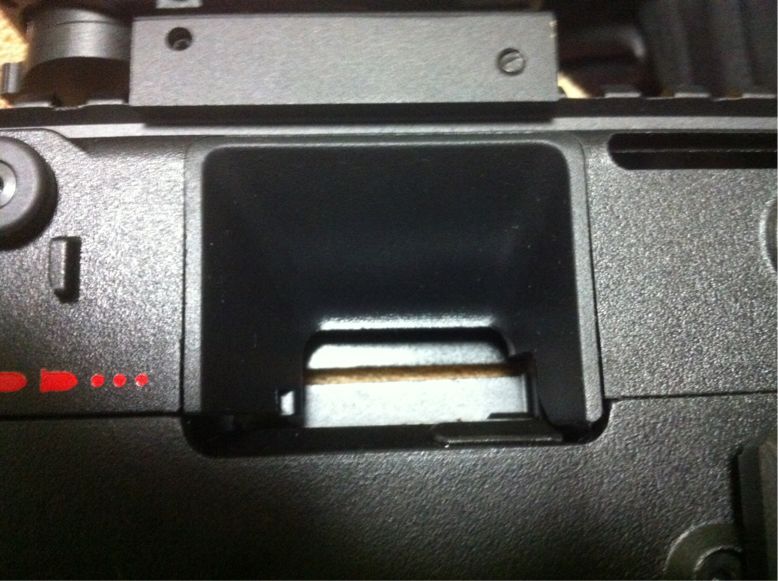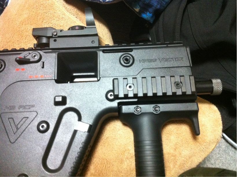 グリップを外すと20mmレールが出て来る。ここにグレネードランチャーが取り付けられそうだ(笑)